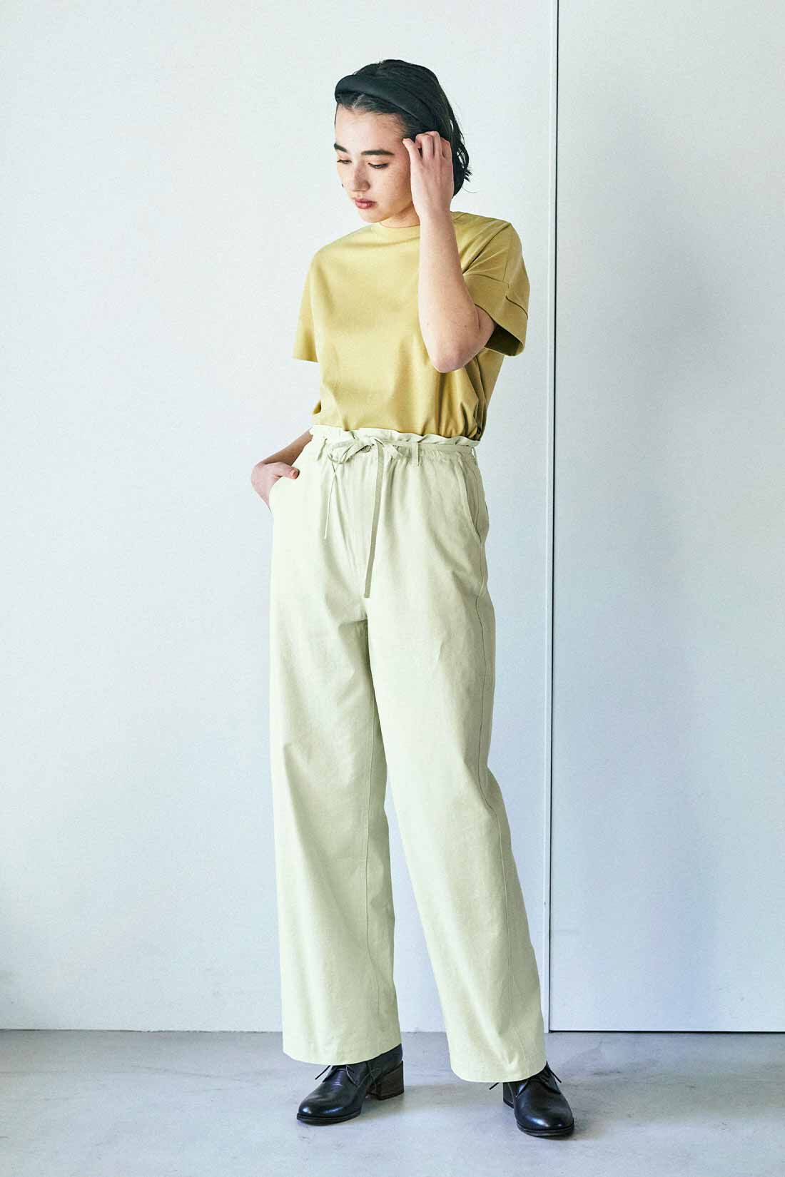 「身軽になるあたたかい季節は、どうしてもコーディネートがマンネリ化しがち。手持ちの服に気軽に取り入れられて、装いの完成度を高めてくれるアイテムを企画しました」(編集T) POINT 1春らしいやさしい色合い シンプルなコーディネートもおしゃれに仕上がるきれい色。インナーを気にせずはけるほどよい厚みの生地です。 POINT 2すっきりワイドストレート きれいめにもカジュアルにもはきまわしがきく、心地よい張りと落ち感があるワイドストレートシルエット。 POINT 3ウエストゴムでらくちん らくなはき心地のウエストゴムでありながら、前ファスナーで腰まわりはすっきり。共布のリボンもポイント。