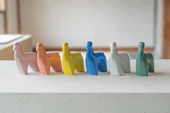 集めた六彩馬を並べるだけで、華やかな一角に。九谷の磁器本来の「白」、五彩と呼ばれる絵付けの伝統色「赤・青・黄・緑・紫」を釉薬で表現し、色彩を調整してモダンな印象に仕上ています。どこか北欧の雰囲気を感じるのは、アレンジによって生まれた新たな彩りにも影響を受けているのかもしれません。